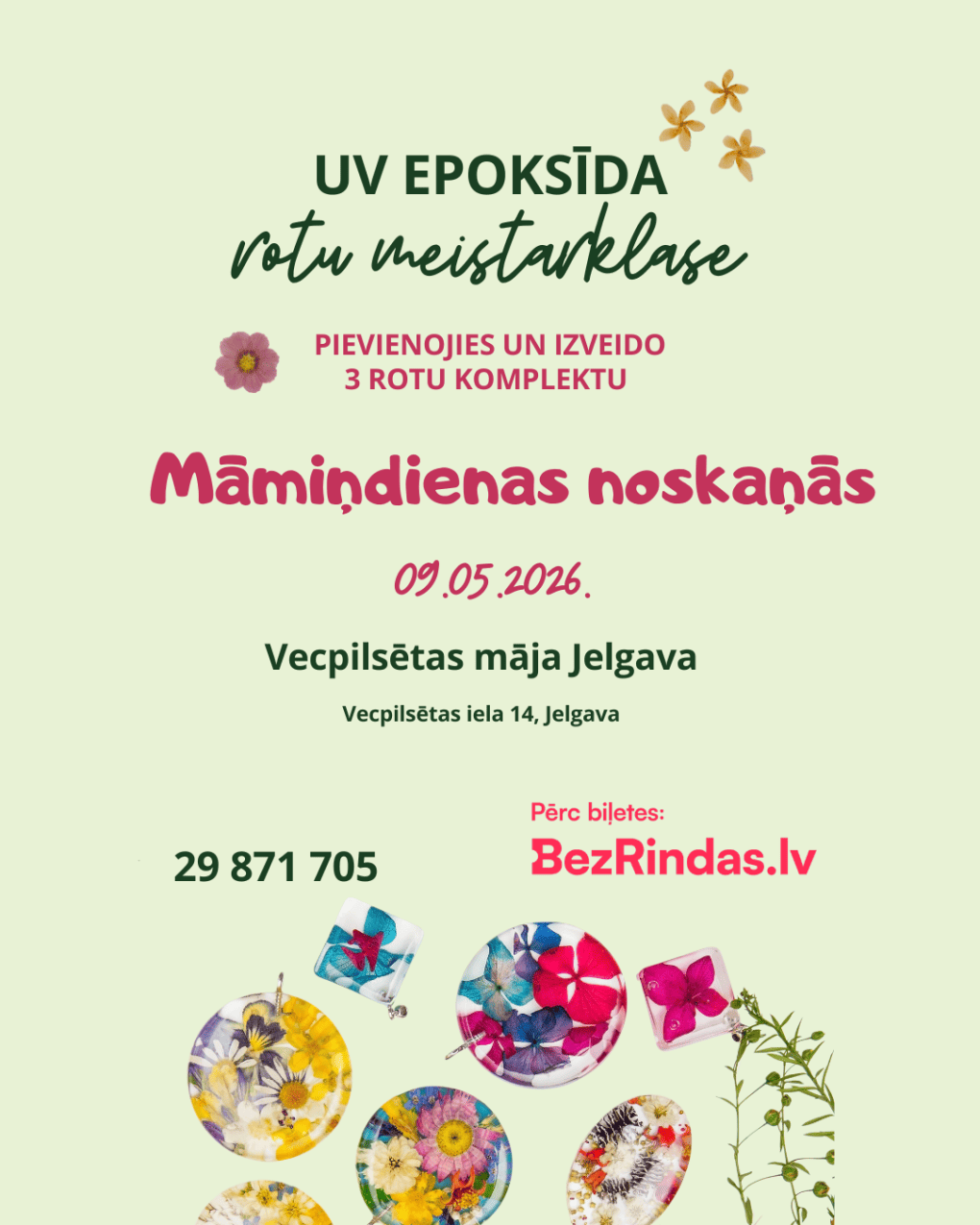 ✨ 9. maijā plkst. 10.00 aicinām Tevi uz UV epoksīda rotu meistarklasi Jelgavā, kur kopā radīsim trīs unikālas rotas – tieši tādas, kādas piestāv Tev vai kļūs par īpašu dāvanu mammai.