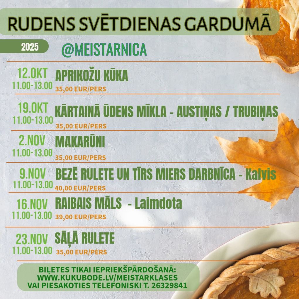 Iegūsi labi pavadītu laiku un jaunas zināšanas, ar kurām pārsteigt savus mājiniekus! Savukārt par visu pārējo parūpēsimies mēs - nodrošinām priekšautu un galvassegu, receptes izdruku, kā arī brīnišķīgu atmosfēru ar dzērienu pēc dalībnieka izvēles.