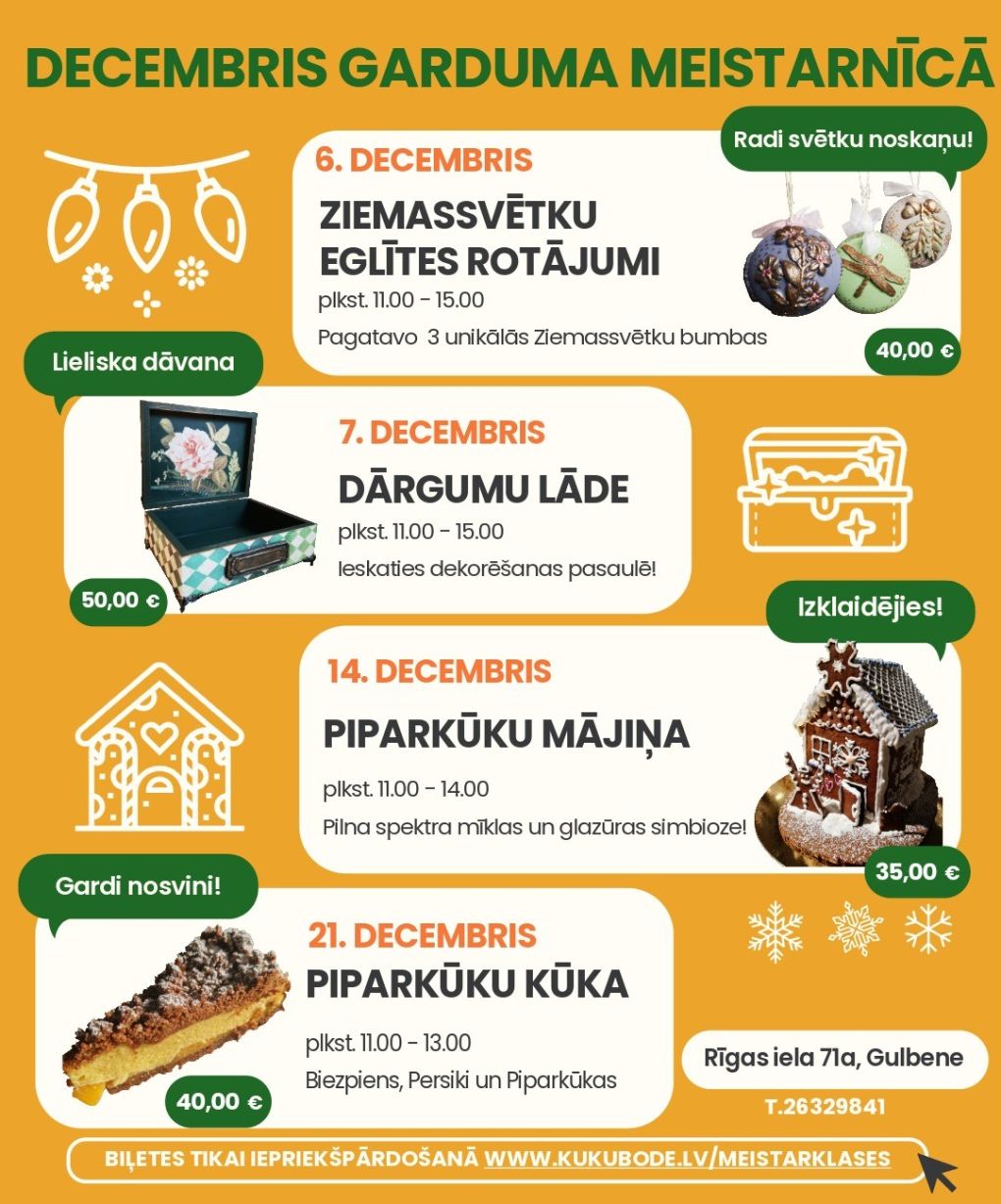 Ziemassvētku gaidīšanas laikā, šādas darbnīciņas ir ļoti tīkamas svētku atmosfēras radīšanai. Šis būs ļoti īpaši un sirsnīgi, jo darbnīcu vadīs pati saimniece Inese. Dekorēšana jau kādu laiku ir viņas rudens/ziemas hobijs, un reizi gadā viņa ir gatava ar šīm zināšanām dalīties un iemācīs mūs pagatavot īpašus Ziemassvētku rotājumus, kurus var iekarināt eglītē vai izmantot kā interjera dekoru jebkurā citā vietā.