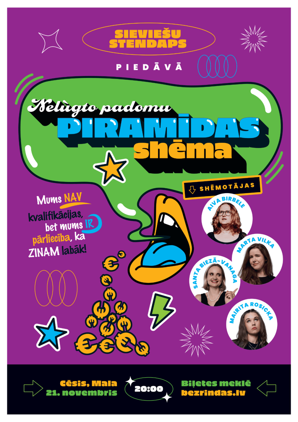 Sievietes uz skatuves dalīsies ar visgudrākajiem “padomiem”, kurus viņas ir gan dzirdējušas, gan pašas reiz teikušas (protams, tikai aiz mīlestības). No attiecību un karjeras guru līdz virtuves ekspertiem un “zinu, kas tev der” dzīves treneriem – šeit uzzināsi, kā uzbūvēt savu personīgo nelūgto padomu piramīdu un vēl paspēt pajokot par to.