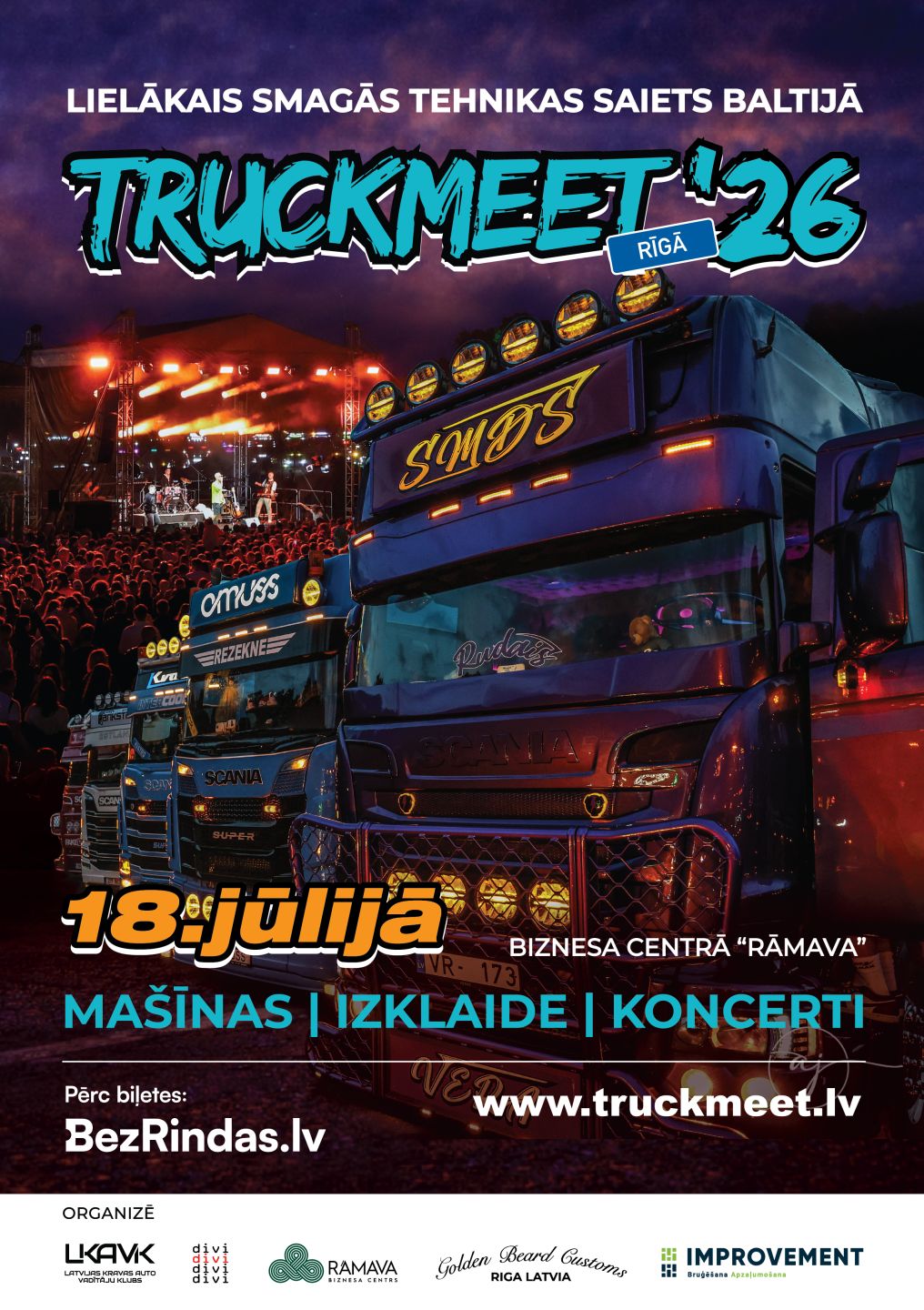 TRUCKMEET '26 ir Latvijā lielākais pasākums kravas auto vadītājiem un nozares entuziastiem, kas 2026. gadā paplašinās un maina savu norises vietu, pārceļoties uz Rīgu. Pasākums, kas aizsākās Engurē, šogad pulcēs vēl nebijušu skaitu pašmāju un ārzemju spēkratus, profesionāļus un interesentus biznesa centrā "RĀMAVA".
