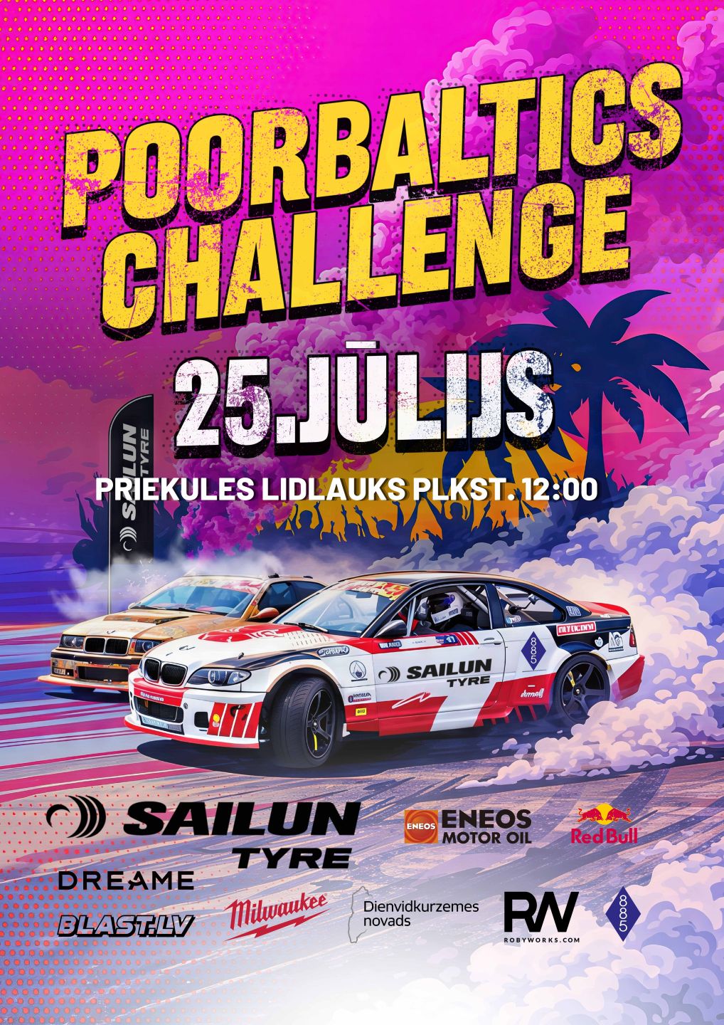 Ar prieku paziņojam, ka šī gada 25.jūlijā Priekules lidlaukā visus gaidīsim uz Poorbaltics challenge pasākumu! Šis ir vienas dienas auto entuziastu pasākums, kurā jau sesto gadu tiksimies, lai kopā uzlādētu enerģiju, satiktu draugus, baudītu lielisku atmosfēru un pavadītu neaizmirstamu dienu.